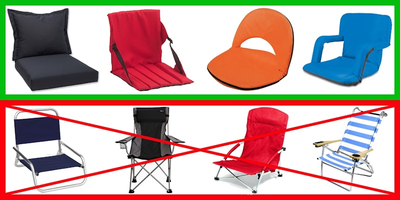 Small blankets and portable stadium-seat-style back supports are permitted on the lawn. Chairs are not allowed as their legs do not function on our sloped lawn. See Lawn Seating below.